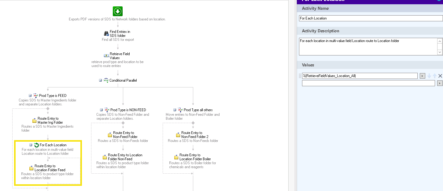 I have a workflow that is used to create folders based on it's contents (multi-val folders image.)  What it does is creates a folder only for the first value in the multi-value field and never gets to the other values.  I've tried putting a 'For Every Value' flow control in and it recognizes the multiple occurrences, but for every occurrence it processes the first value in the multi-value field over again. (mult-val loc image - Loc = SHP and SPG)