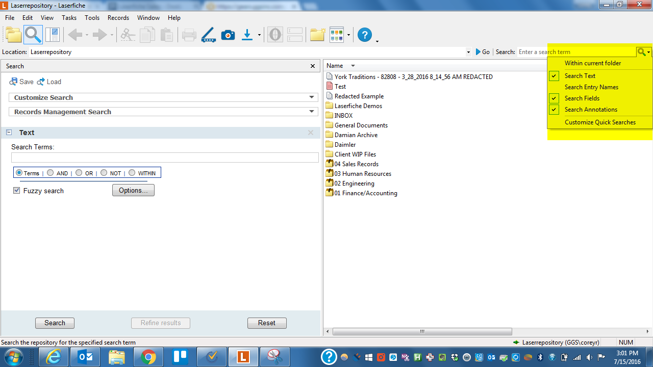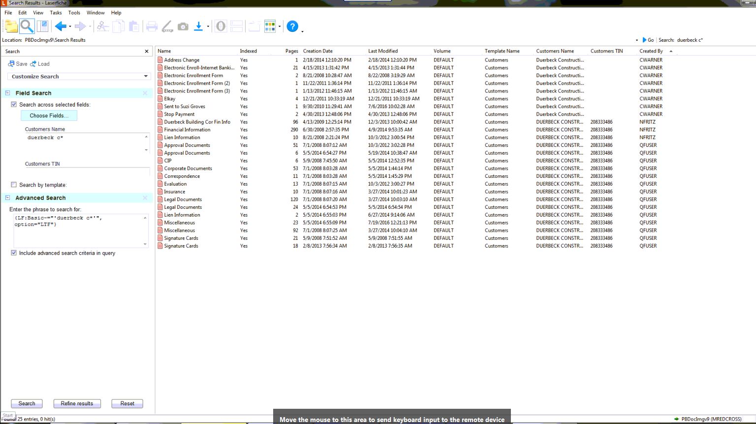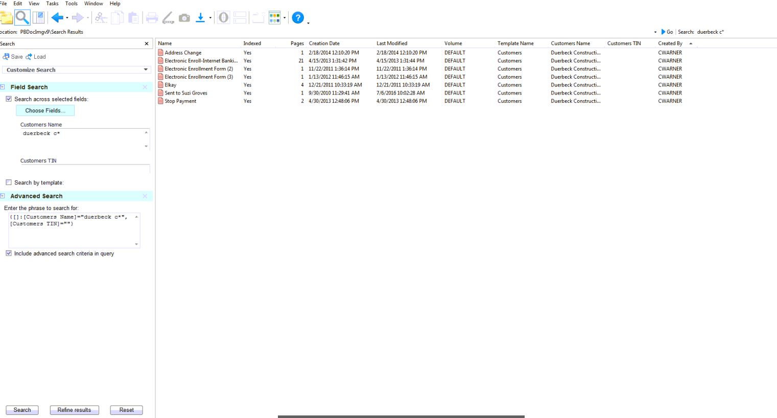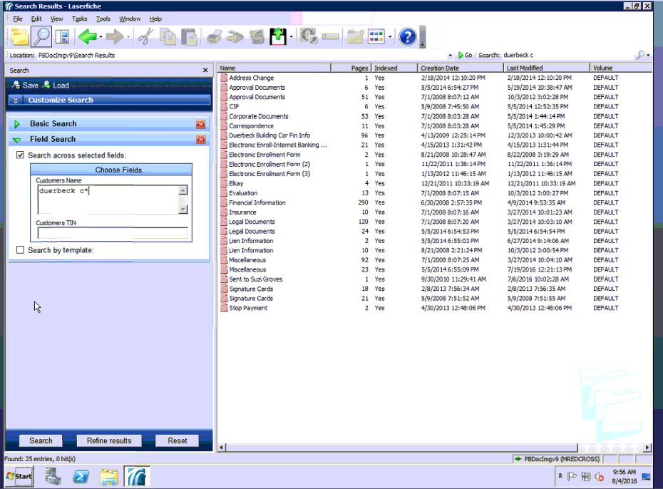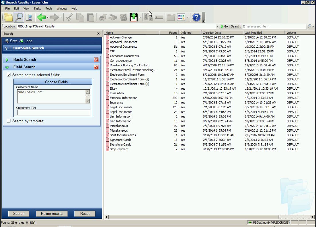 For our client, In old version of laserfiche(8.2) when using the basic field search for one of our customers, it returns all of the docs (25). Which matches if we use a advanced search. But in version 9.2 it does not return the same results. If I search using the template search for the same customer it will return 25 entries, but if I use the basic field search it only returns 7 items. They have searched several of our settings and are unable to find any differences from their older and current versions.