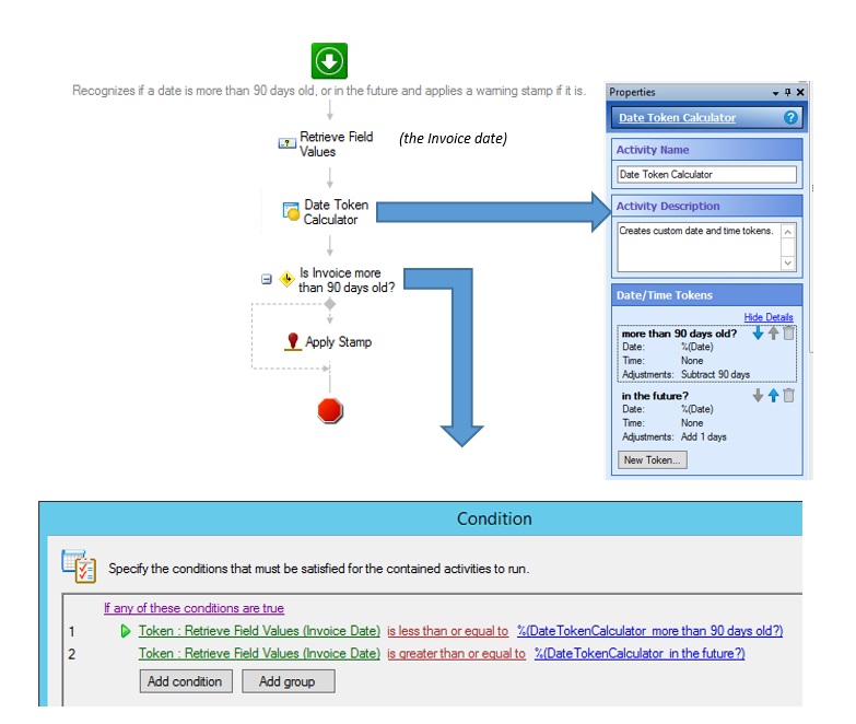 I have a invoice approval workflow with a field for invoice date. I would like to add a step in which the system compares the invoice date to the entry date, and if it more than 90 days old, or is any date in the future a 'check date' stamp is applied as a warning to the next user in the flow.