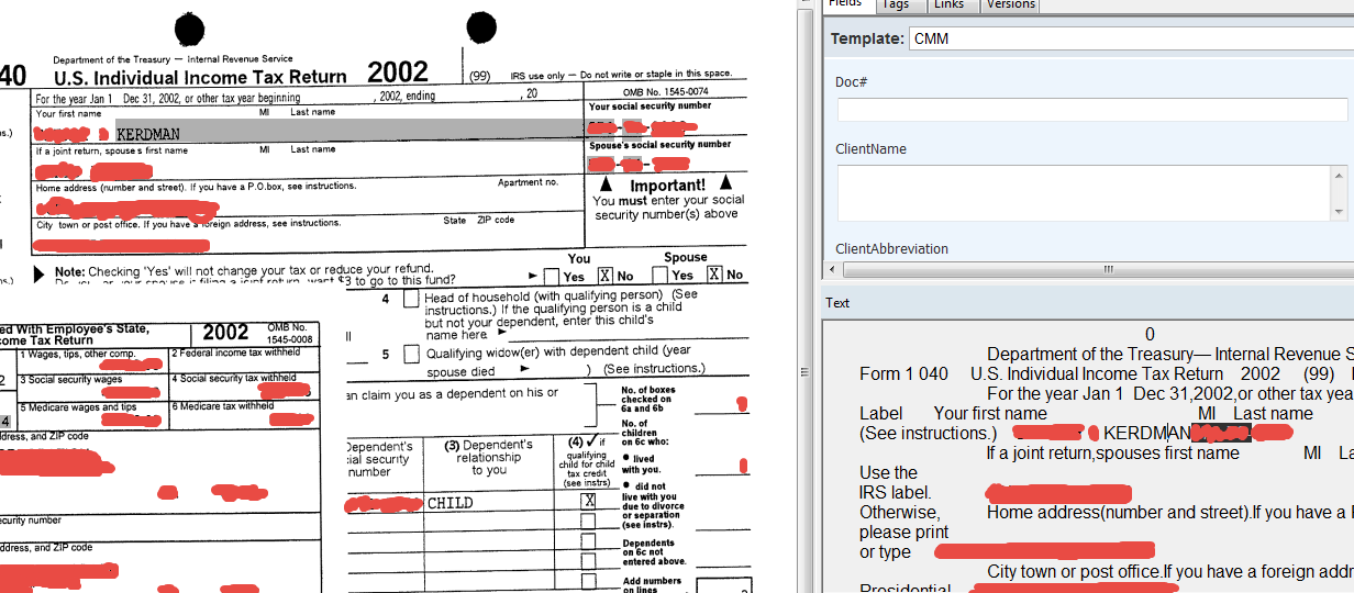 Some of the time, it works great. Other times, it redacts all of the digits in the image, or redacts stuff before the SSN in the image. (The attached png file shows a case where the word before the social security number is redacted in the image, but the text redaction is correct.) The redaction in the text is always correct (just the first digits redacted with the last 4 unredacted). I also have one case where the document is failing to save to the repository once it's finished because it's trying to create a redaction rectangle that's bigger than the page for some reason.