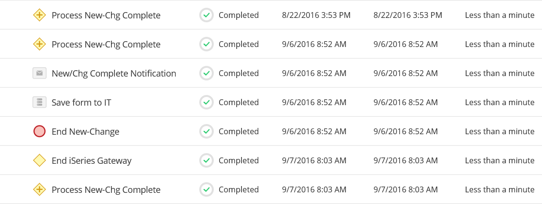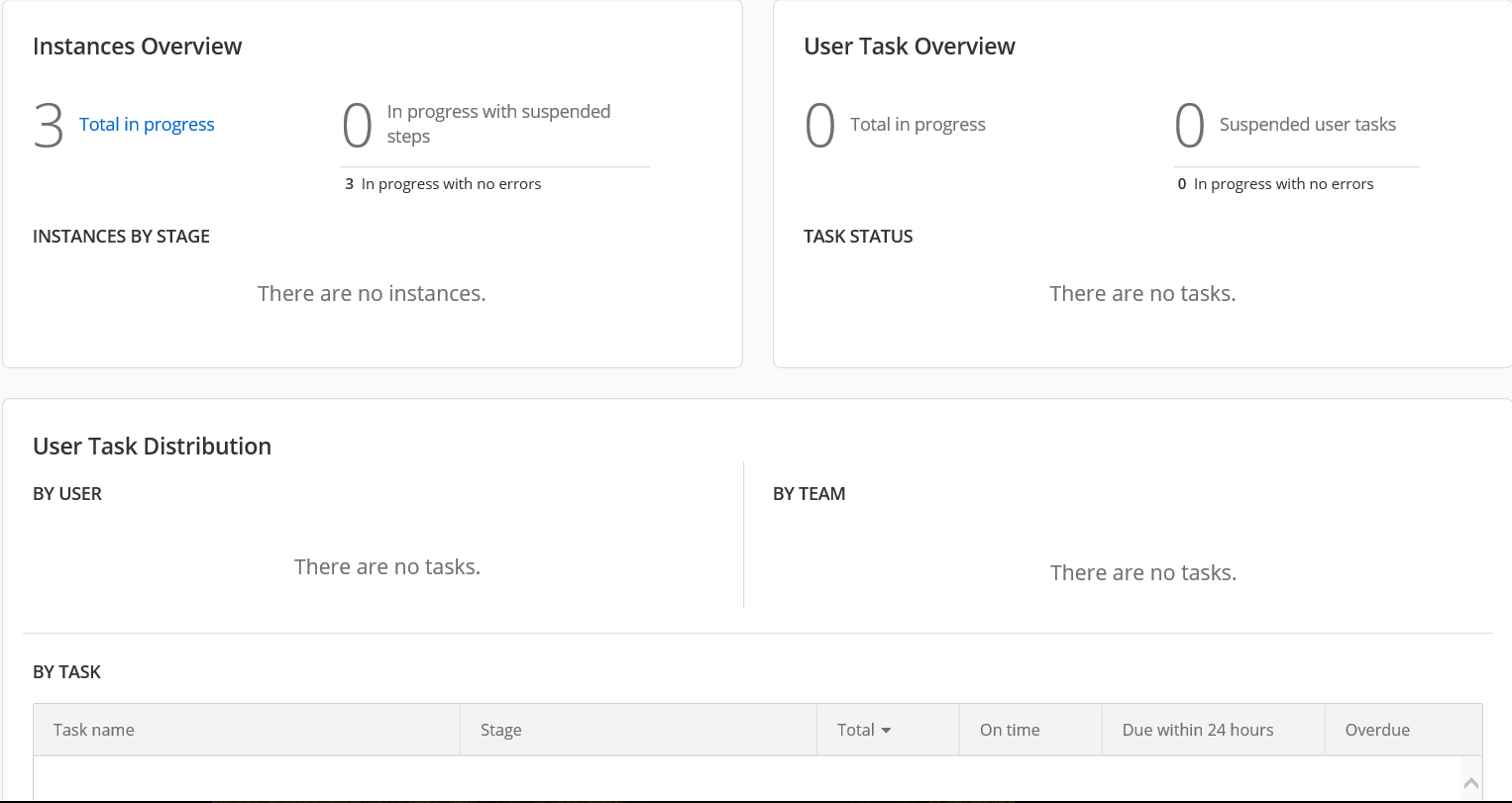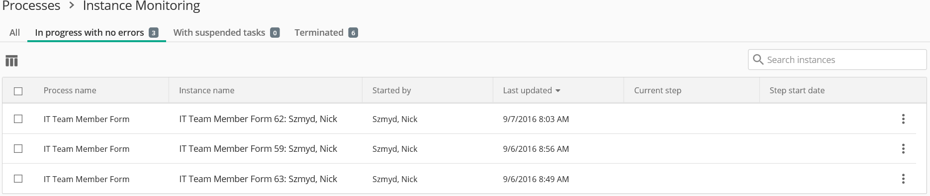 When I look at the three instances they show as In Progress but do not show any tasks open. When I go into each instance, two show tasks completed up to a point with no End task while one shows up with and End task and then shows the task that was completed this morning. All show as open.