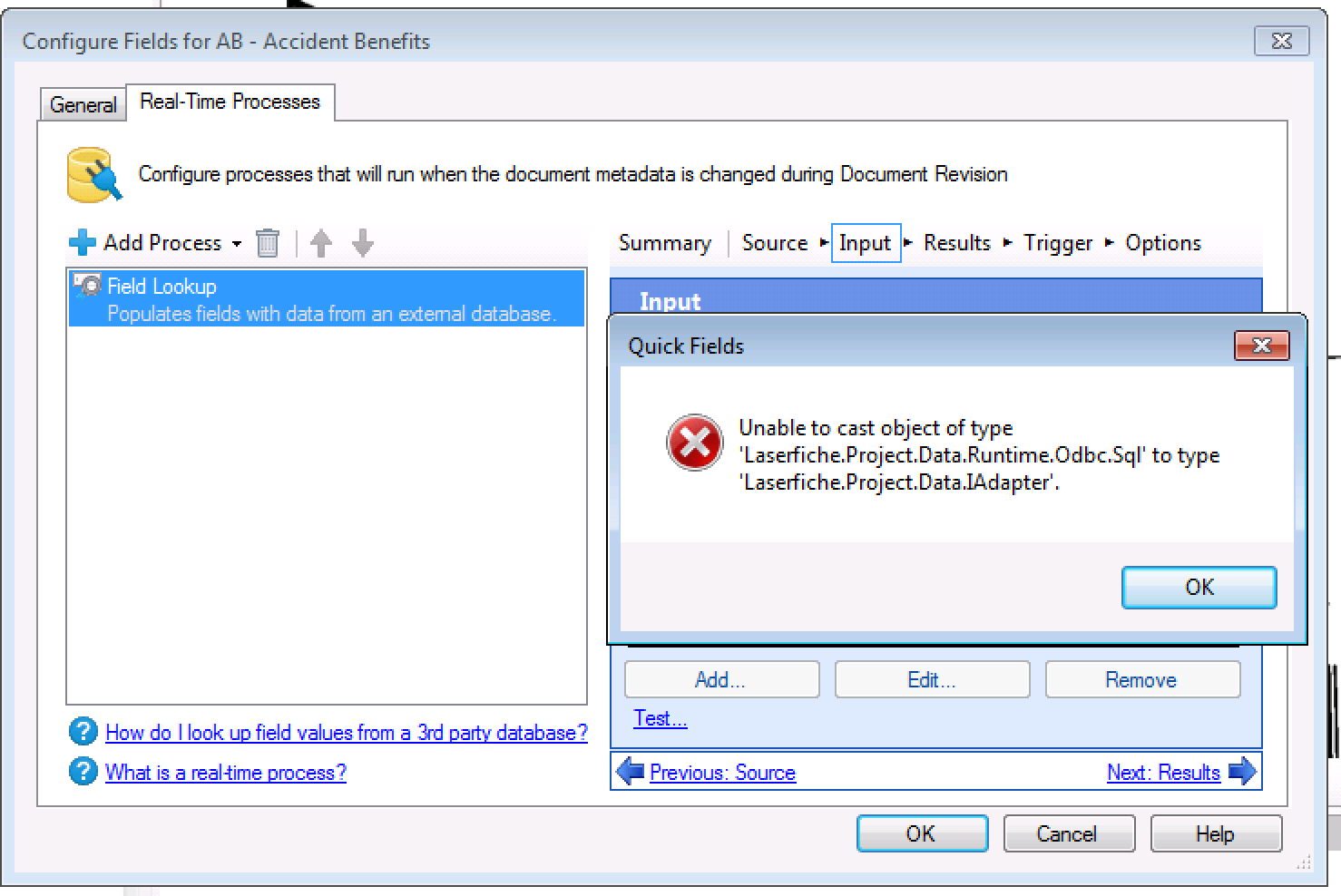I am trying to configure a Quickfields session to do a database lookup to an external table dbo. however when I do I get the below errors.