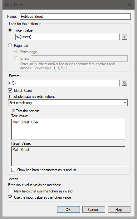 I have a form that has a field which contains Street Name a comma and then the town . Ex "Main St , Boston". I would like to take only the street name as a token to populate part of a template. Is there a way to use the OCR and pull only a substring using the comma as a delimiter?
