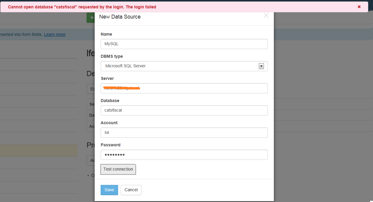 6. In the LF Forms Administration Data Sources page, I am unable to set up a New Data Source to Microsoft SQL (using the MS SQL account) . The error I am receiving is "Cannot open database "data base name" requested by the login. The login failed".