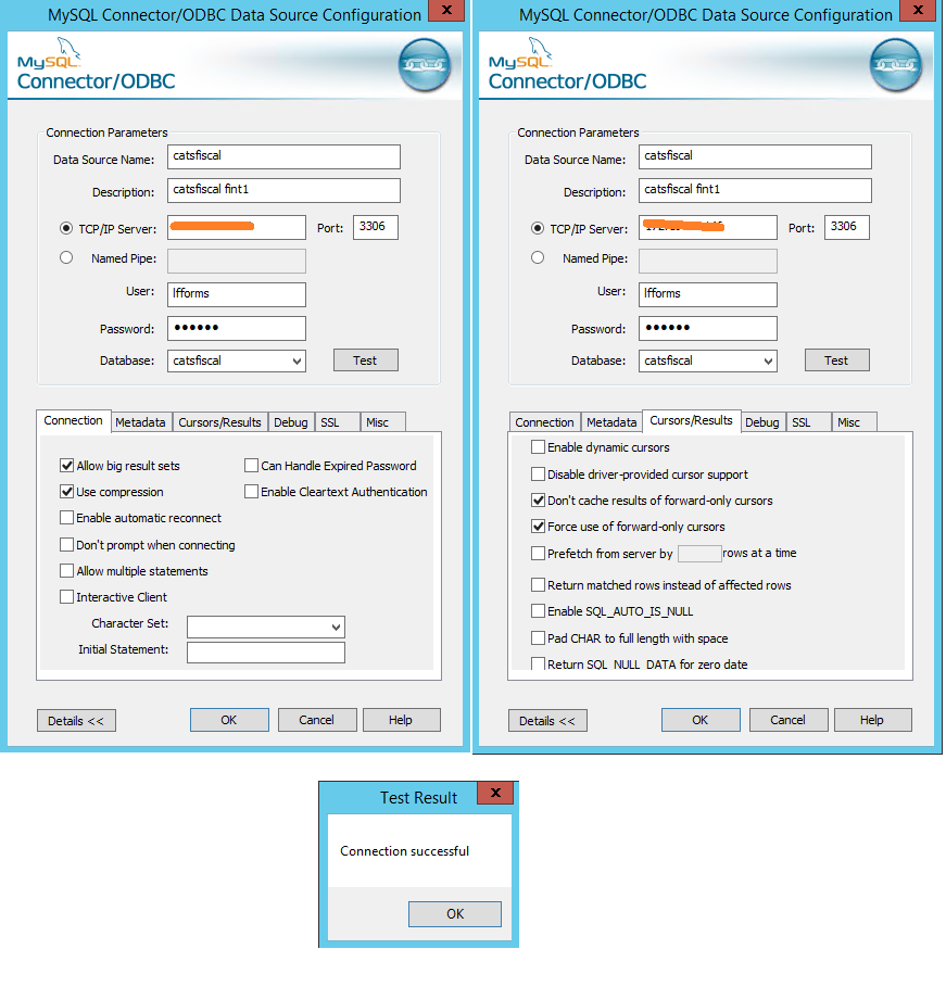 1. Set up a user lfforms (PHPMyAdmin) in MySQL. Installed and configured the MySQL ODBC driver that tested successfully (see attached).