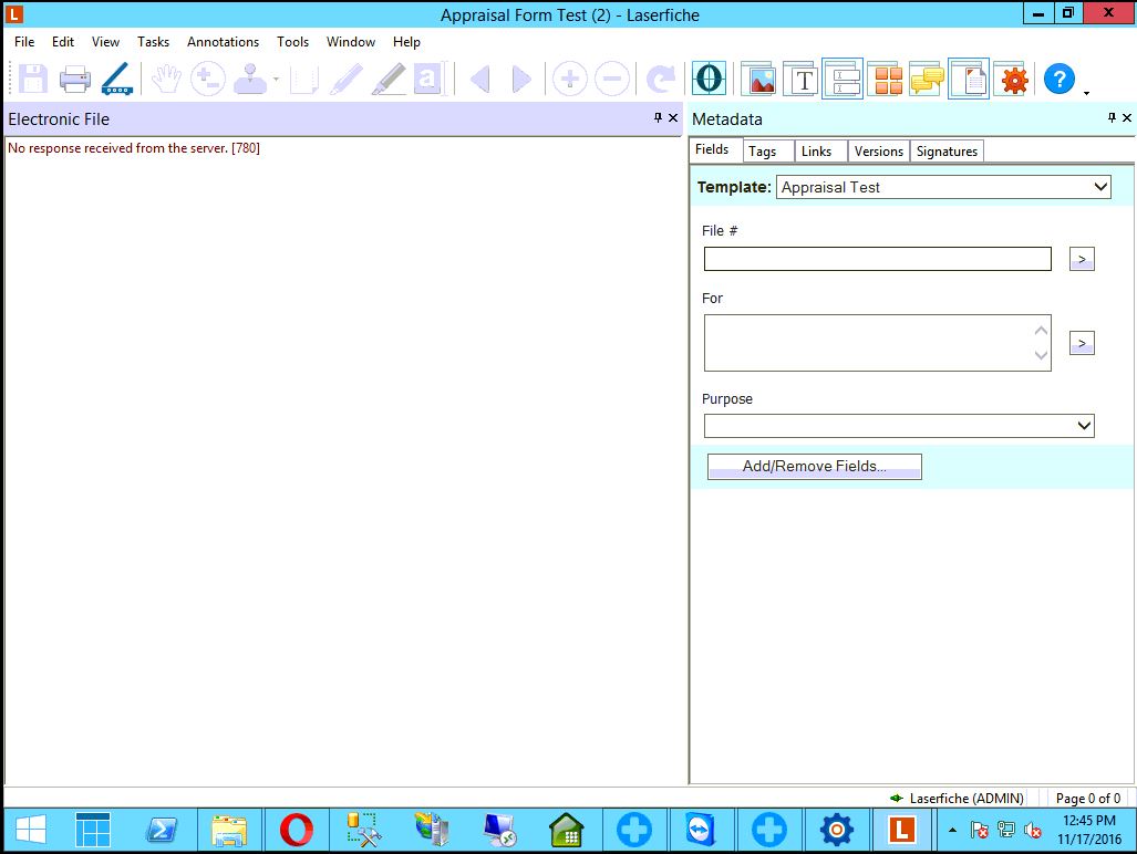 LF client 9.2.1.635 if I drag a PDF into a folder in the repository it opens in the clients Electronic File Pane, however if I assign a template to this same PDF I receive "No response received from the server [780]. The meta date (template) is there but nothing except the error in the preview. Anybody know what's going on here? Thanks Wendi