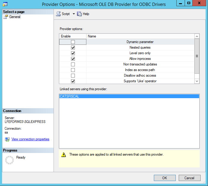 2. Modify the Server Objects / Linked Servers / Providers / MSDASQL properties (see attached)