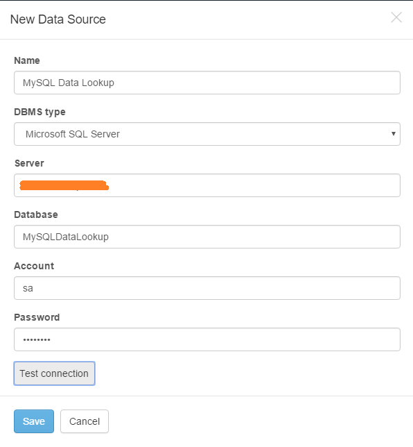 12. Go back to Forms Administration and on the Data Source tab create a new Data Source and test the connection (make sure you have the correct Database name from Step 6).