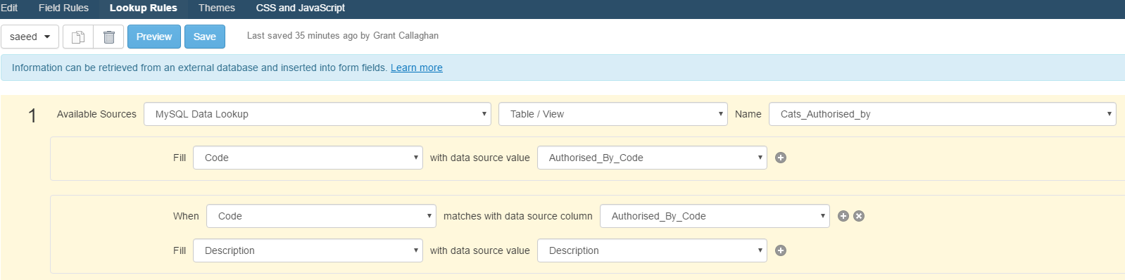 14. Go to your Form process and into the Lookup rules add your new create DB Data source