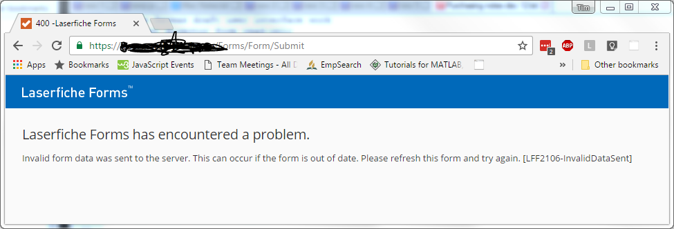 Are there any ways to improve management of sessions in Laserfiche forms? By default, if your session times out before you submit a form you get a very uninformative error message that says, "Laserfiche Forms has encountered a problem." A second line says, "Invalid form data was sent to the server. This can occur if the form is out of date. Please refresh this form and try again. [LFF2016-InvalidDataSent]" This would suggest to me that the form needs to be updated by the developer so that it submits the correct data to the server. It says nothing about a time limit on the web session.
