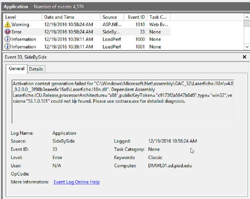You can see the additional error within Application Even Log. I am trying to figure out how to obtain the 32-bit version of 'Laserfiche.I18n.dll' and where within the windows directory do I place/store the file.