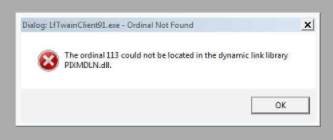 My client is receiving the error "The ordinal 113 could not be located in the dynamic link library PIXMDLN.dll" when attempting to scan in laserfiche. They get the error in both TWAIN and ScanConnect engines. Multiple users receive the error under different lf accounts and windows accounts. We have tried a repair of drivers and laserfiche but nothing works. Looking up the dll online tells me that it has to do with adobe acrobat, but I made sure that adobe acrobat reader is installed. They are on version 10.1.0.151 and using a Canon Dr-3010C.