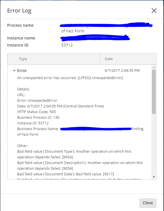We've encountered this issue before with dd/MM/yyyy date formats on Forms and seemed to have resolved it with a restart of the services, but service and full server restarts aren't resolving the issue this time. It's a simple Forms process with a single service task to save the form to the repository. The date field on the form is failing with the error "Bad field value [9017]" when Forms runs the "Save to repository" task and tries to populate the date field in the template.