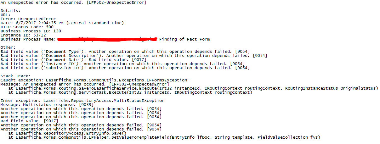 - I've tested the "Configure Fields" options in the Save to Repository task with both the date field from the form, as well as the Instance initiated date and get the same error.
