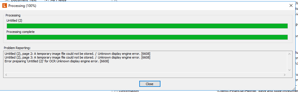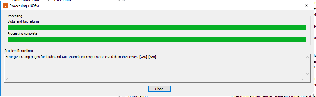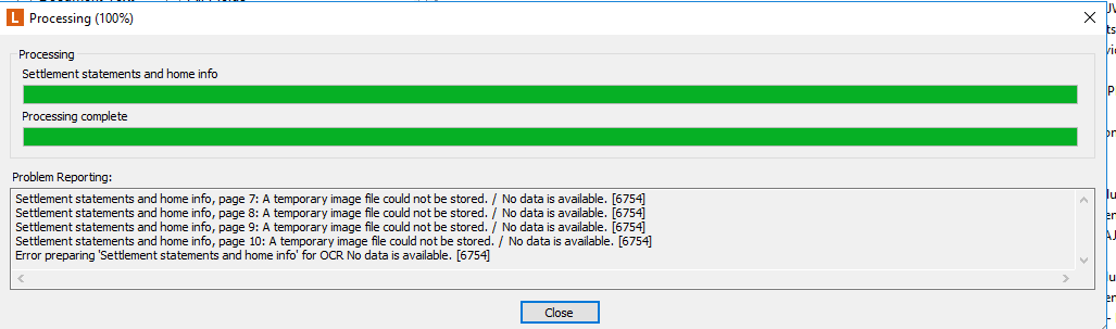 My client is getting the 780 error every time they try to generate pages. They also get other errors, but intermittently(6754 and 6608). This is directly on the server and we have reinstalled the LF client and OCR software, but still get the error. We have also set snapshot to be the device it uses to generate pages. There has also been a recent upgrade, they are on 10.2.0.839. Has anyone else gotten this error before? There are also no details to explore, and no entries in the even logs related to this.