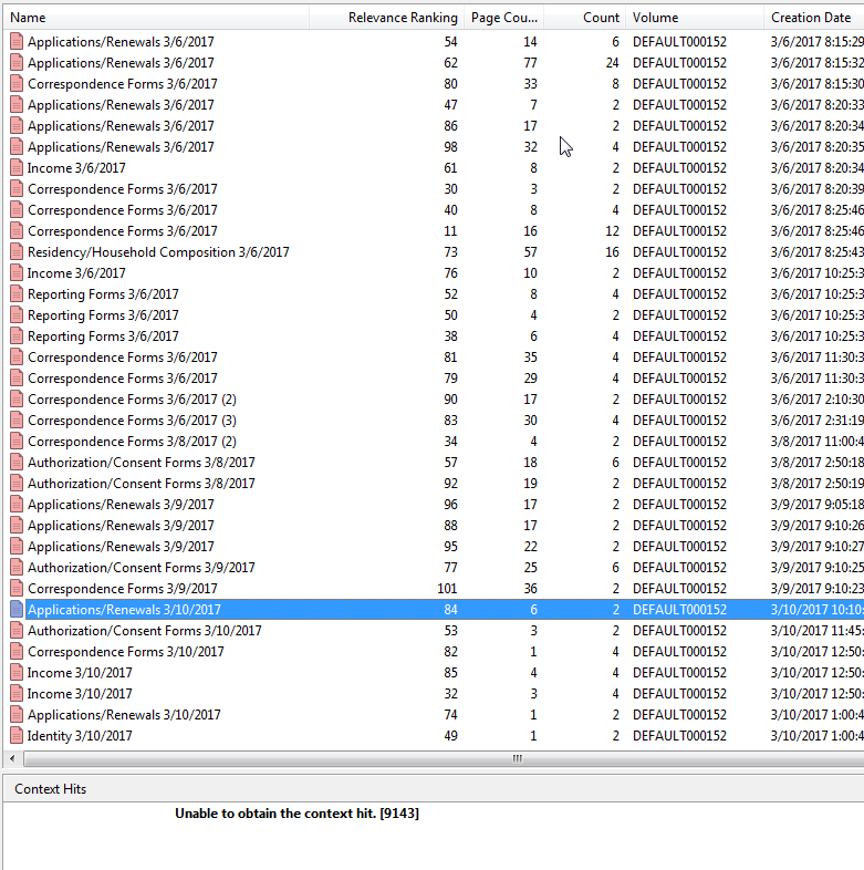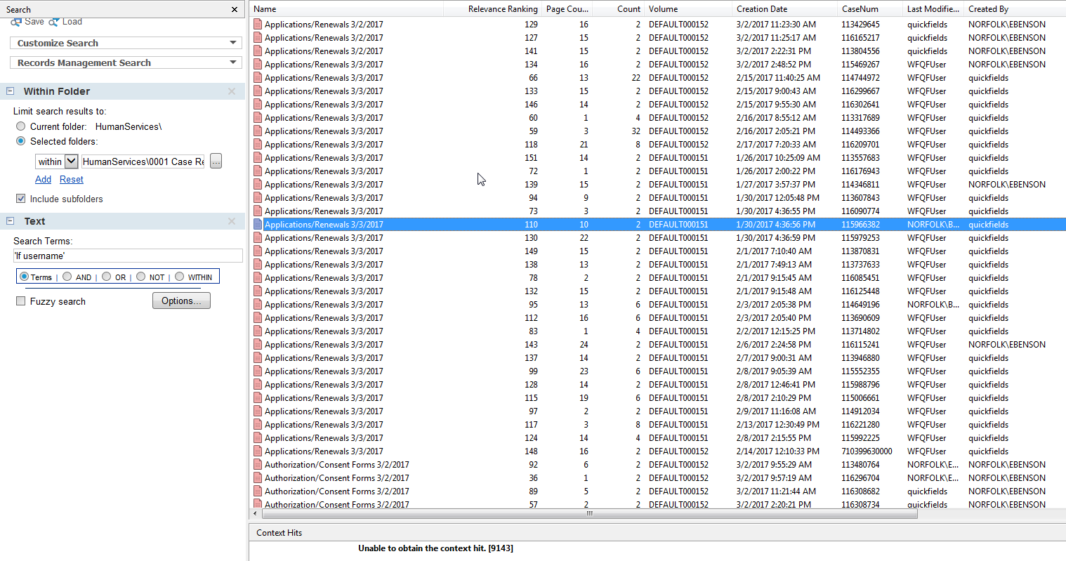 However, when they search on the phrase again, they get the same 134 hits but the phrase is not in any of the documents. Per screenshot, it states ‘Unable to obtain the context hit….’. It appears it is finding the phrase even if it is not there.