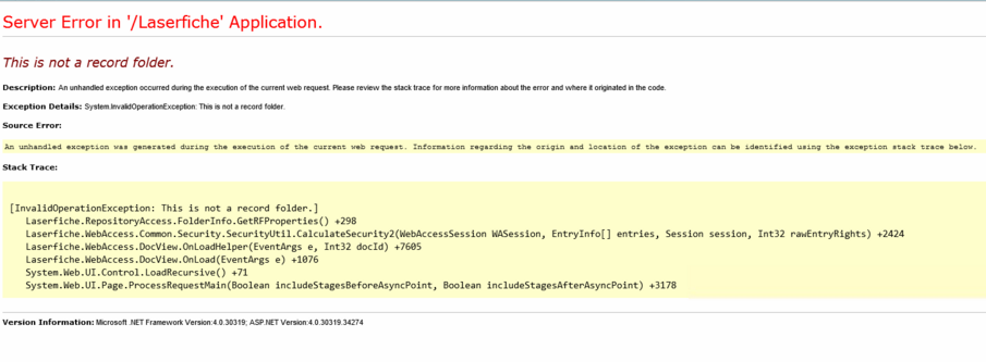Stack trace:    at Laserfiche.RepositoryAccess.FolderInfo.GetRFProperties()