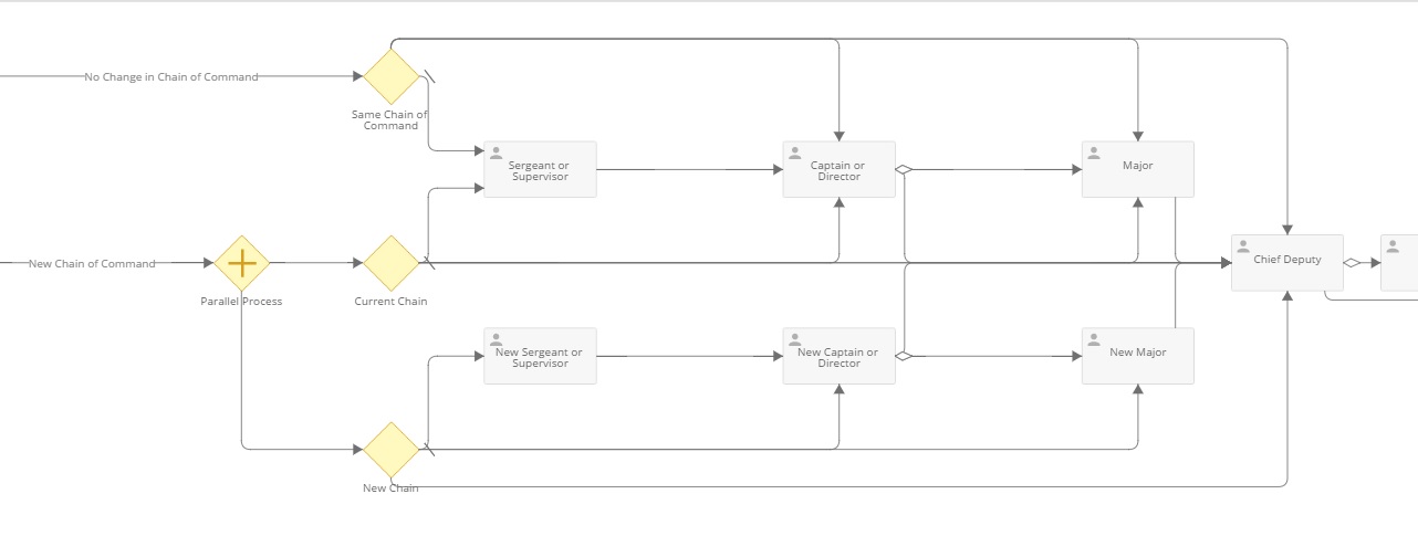 I am working on a pretty complex form. When the form is submitted, we ask if there is a change in the employees chain of command. If they mark yes then in the Exclusive Gateway it will send the form to the parallel path. If they mark no then it will go down the next Exclusive Gateway path.