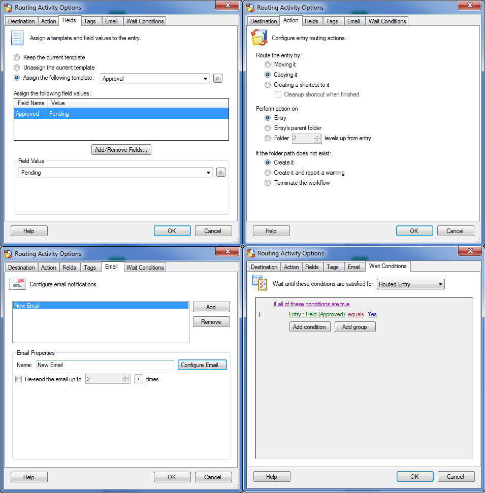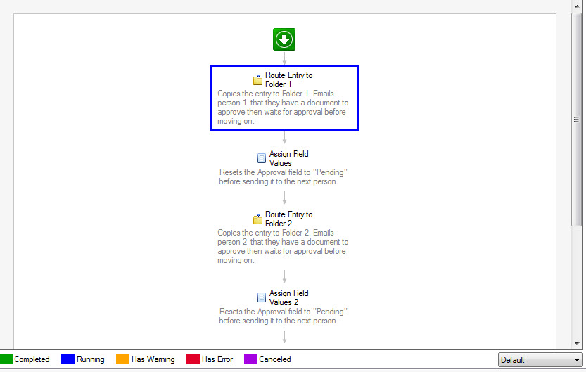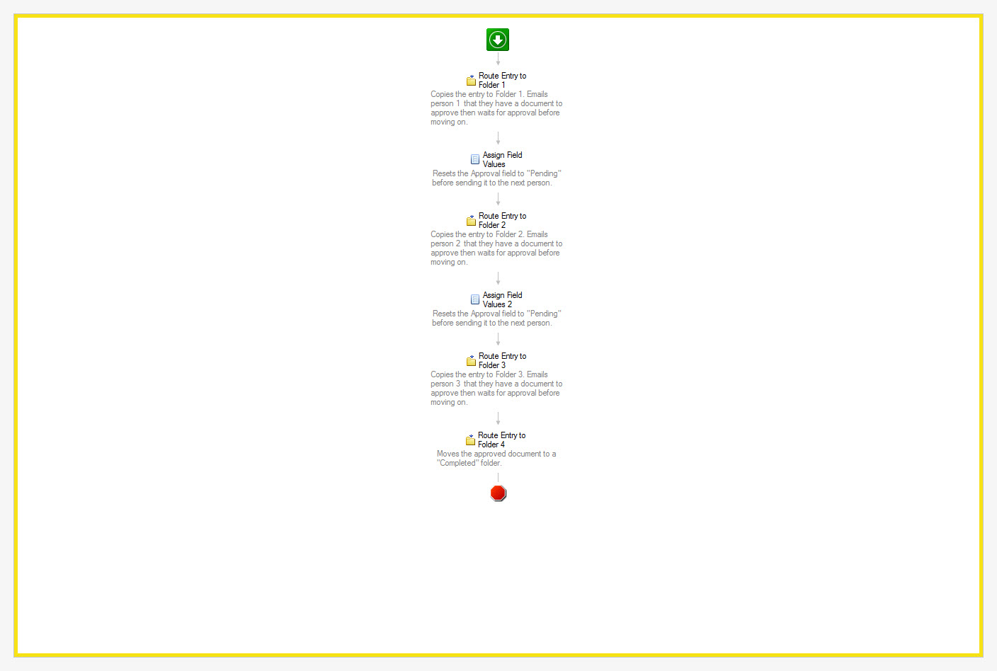 2) "Route Entry to Folder 1" will take it to the folder belong to approval person 1, send them an email letting them know there is something waiting for their approval and then it waits for the approval field to be set to yes.