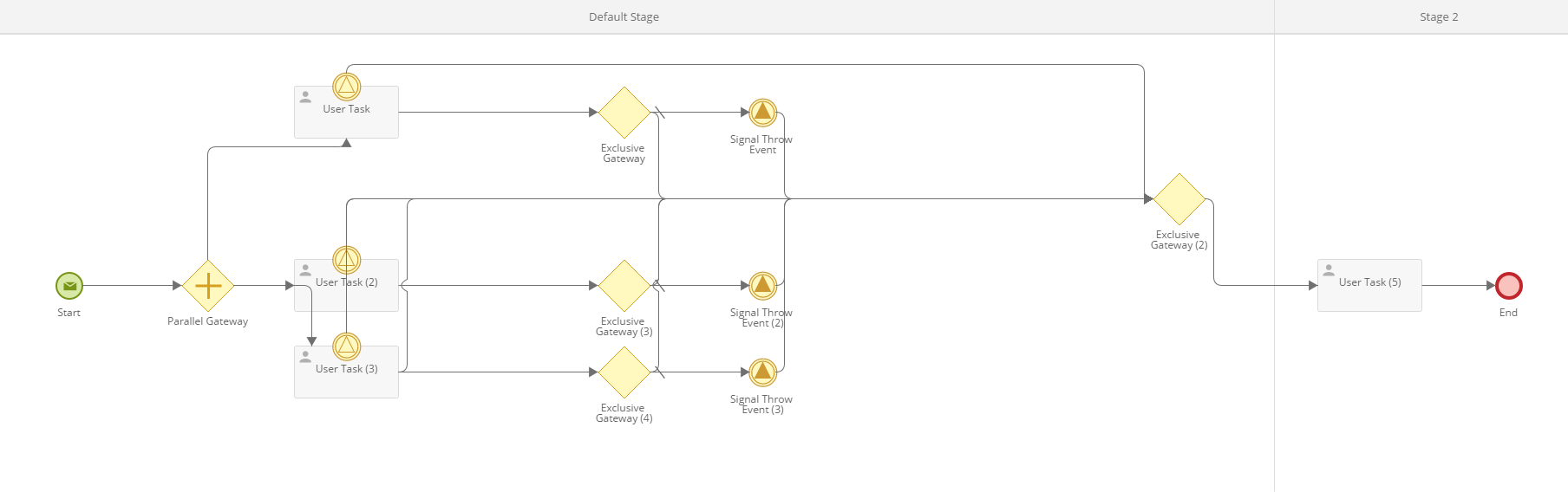 In forms I am trying to send a form to multiple approvers at one time using a parallel gateway. If one rejects I want to remove the task from all other approvers. I have added a throw and catch event that is set to stop the current activity on all other approvers but the process wants me to attach an end event to the catch. If I attach an end event it stops the whole process- If I attach the catch to the next step in the process (a exclusive decision) it creates a task for each catch event, so if one approvers rejects and two catch's are thrown the next step shows three tasks (the same task)- one for each approver. Any help would be appreciated!
