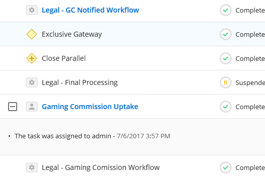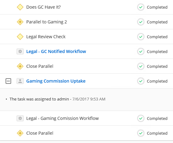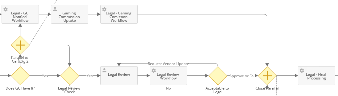 In my test the GC does not have it so it goes up to Parallel to Gaming 2 (confirmed in the Instance monitor. Legal Review is No so it closes the parallel right away (should be correct). Then GC can do its process and finally close the same parallel. The instance monitor shows that it works however it does not seem to move on to the workflow after the parallel.
