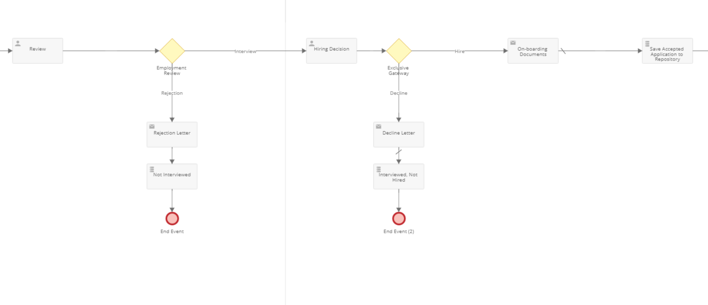 I'm trying to setup a job application process in forms. The first gateway works perfect but when the process gets to the second gateway it is terminated with the following error message "Routing cannot be split to any subsequent branch. XPath evaluation may fail for every possible condition" I have the second gateway set up exactly like the first one (which works fine) so I'm not entirely sure what I'm doing that's triggering this error.