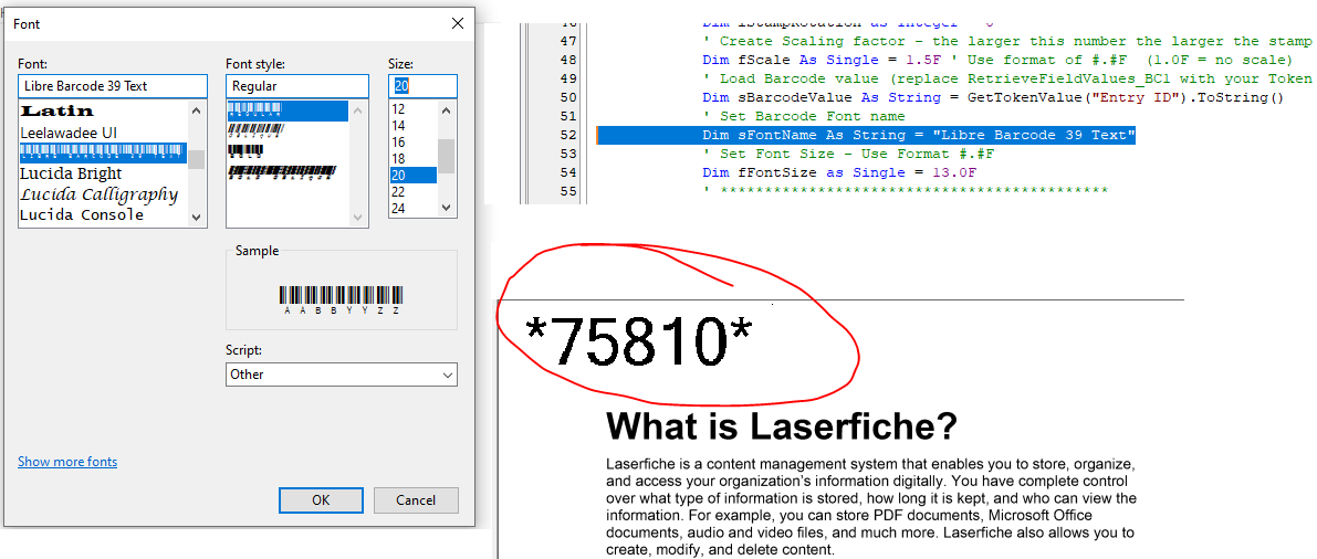 You have to remember that creating the image will be a little slow, but here is a complete script you can use. It is loading and using a locally installed font "Free 3 of 9". With your Barcode DLL, you can remove and replace the code that generates the barcode image and just pass your barcode image into the conversion section of the script.
