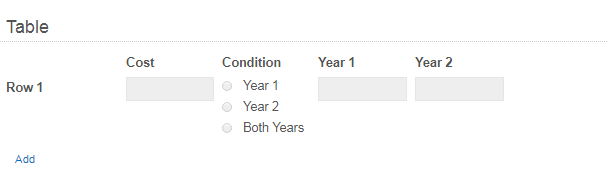 I need to fill Year 1 or Year 2 with the Cost value for each row, based on the selection of the Condition column.