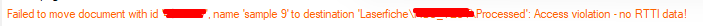 The Quick Fields session is configured to immediately store documents to Laserfiche. If their is an error, then it sits in the Revision Pane. As the QF Session was still running, I updated one of the documents to remove the red flag and attempted to store the document. Right after I tried storing the document, I received the following error, "Access violation - no RTTI data!"