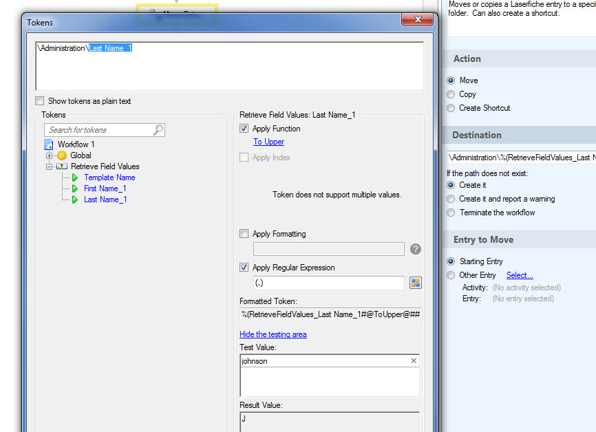 For example if I want to dynamically create a subfolder for everyone who's last name starts with the same letter. I retrieve the Last Name field. Go to move the entry and in the path I put the Last Name token. Then I apply the Expression and Function to the token.
