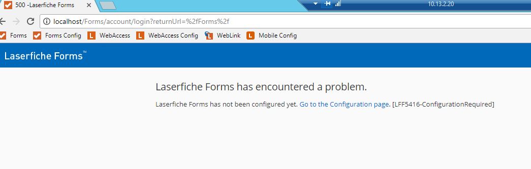 A case was opened with Laserfiche Support. The root issue seemed to be that the identity of the application pool serving the FormsConfig application did not have file system rights to update the configuration files for the Forms application proper. Once this was corrected, the configuration page had to write back to these files. To work around the fact that nothing changed, a dummy database had to be created for Forms to use, then switched back to the actual Forms database for operational use.