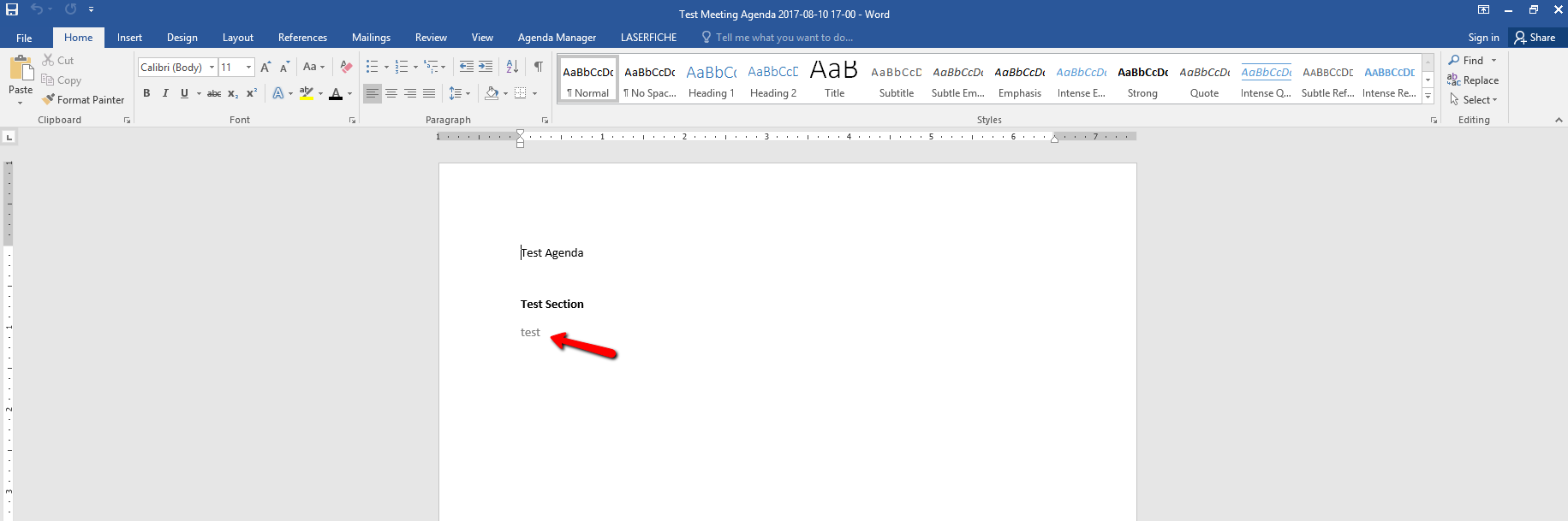 Is there a limitation with Agenda Manager 9 with the way it writes field data when preparing the agenda? I have tried changing the font for a field in the template to several different types and sizes and when the agenda is prepared, the field data is always written in the same font. Notice in the screen shots where, in the template, the font is set to Ariel 14 in Bold but when the agenda is prepared, the data is written as Calibri(Body) 11 in a light gray color. Sections are not affected, they appear as intended, only fields. Is this by design or is there something wrong?