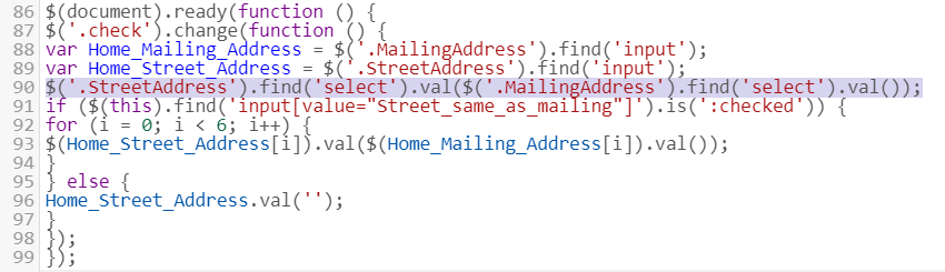 Below is the code that modifies the state field and automatically fills the street address fields. Any ideas why the state field is not being filled and how the code should be changed?