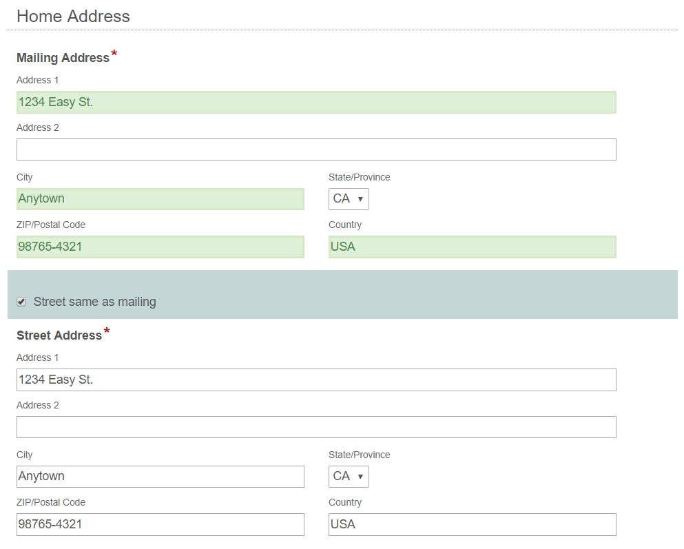 Since there are many instances that forms will require two address fields and the address fields will frequently match (e.g., mailing address and street address, shipping address and billing address, etc.), it may be more efficient to duplicate the address field by checking a box. As you can see from the screenshot, all of the street address fields are automatically filled with the specified mailing address, except for the state field, which has been modified for a drop-down list for the state information.