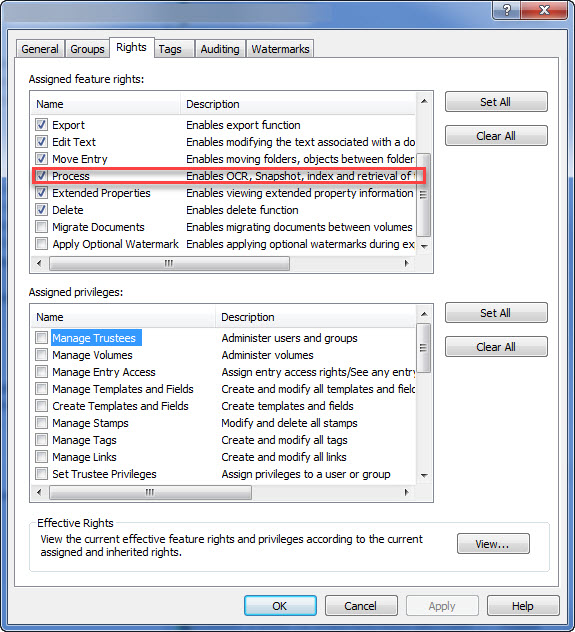 That box is already checked. So, they should have permission to Process, correct? The only boxes that are unchecked under Feature Rights for that username are Delete, Migrate Documents, and Apply Optional Watermarks.