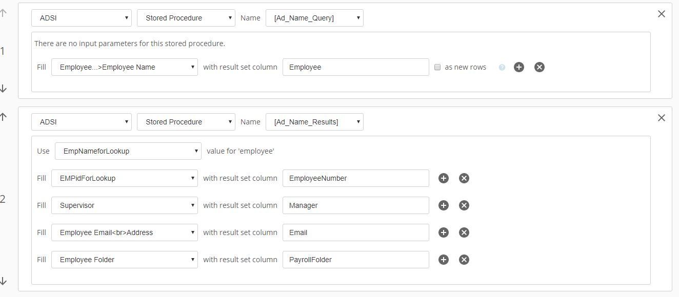 Here is the Forms lookups using that stored procedure (Bottom Image).  I can see that stored procedure in the dropdown for Query Data Activity.  I tried putting the stored procedure in a Custom Query Activity and it always returns -1 row(s) affected.