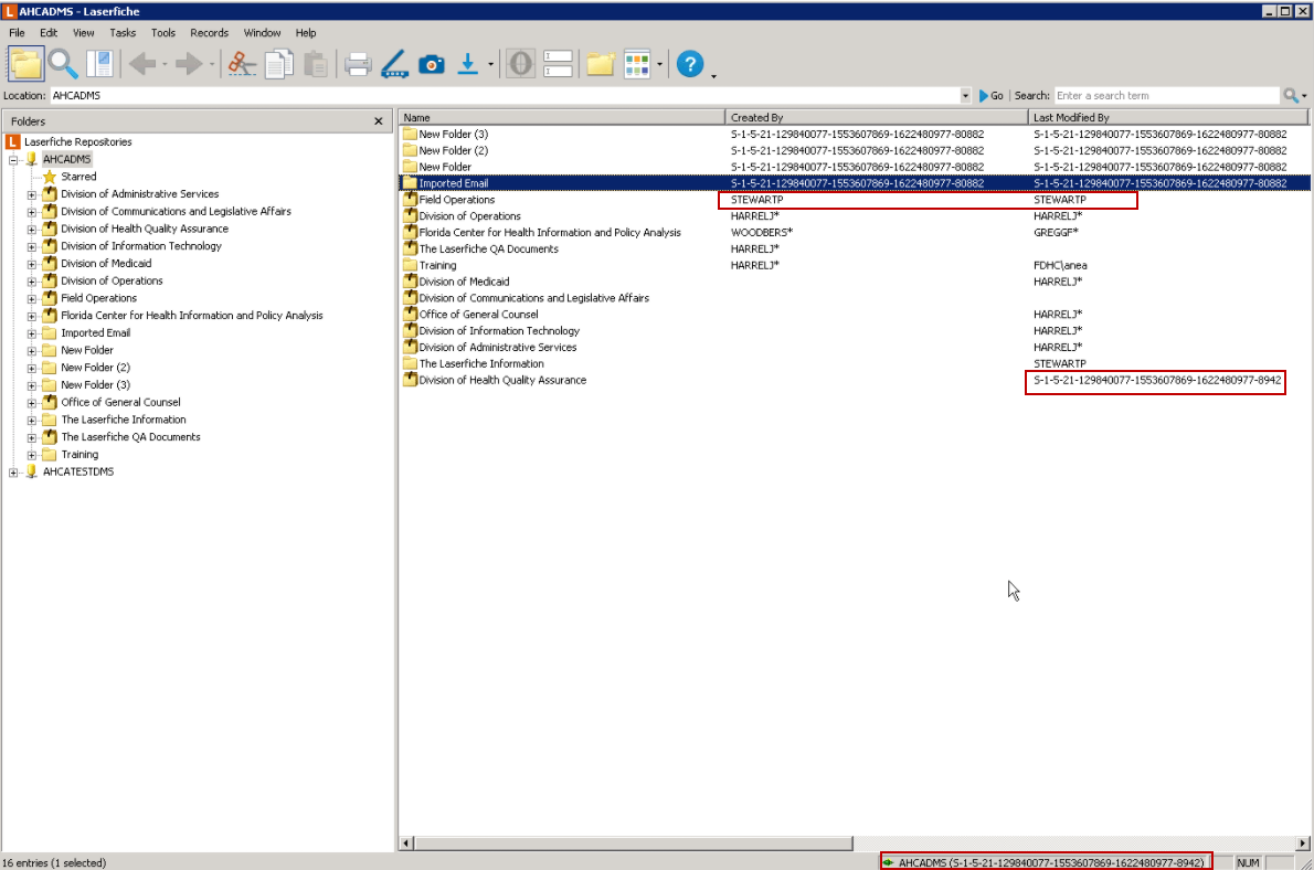 Also for this user as you can see in the first attachment his SID is showing in the bottom right corner, and it is also showing in the Last Modified column for the Division of Health Quality Assurance folder. However, his username shows in the Created By and Last Modified By columns for the Field Operations folder.