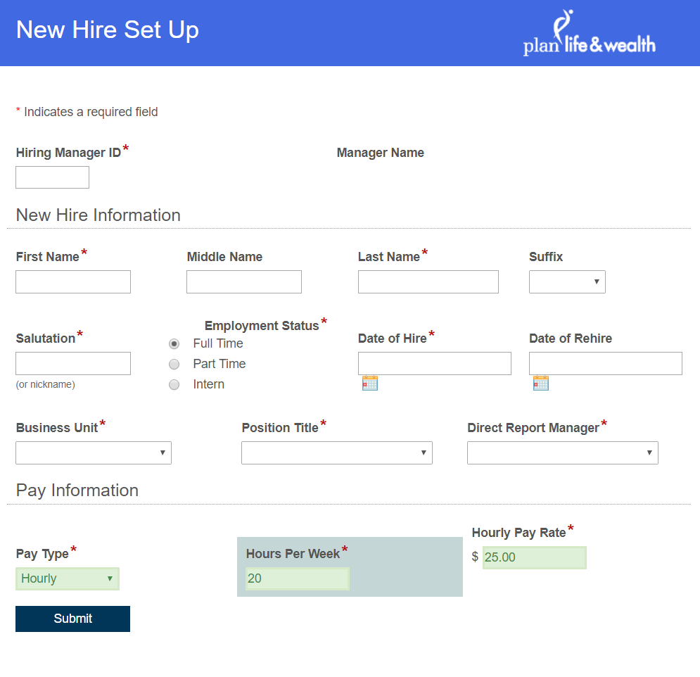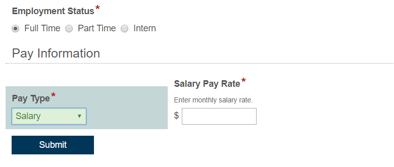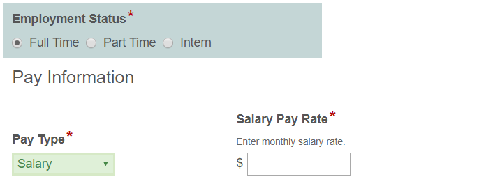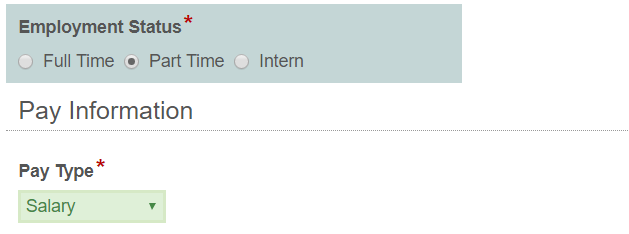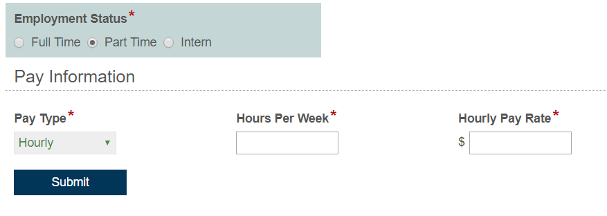 I'm creating a New Hire Set Up Form that includes a radio button field, Employment Status, with three choices: Full Time, Part Time, and Intern. If Full Time choice is selected, the Hours Per Week field must be at least 30, but not greater than 40. If either the Part Time or the Intern choice is selected, the Hours Per Week field must be between 1 and 29.