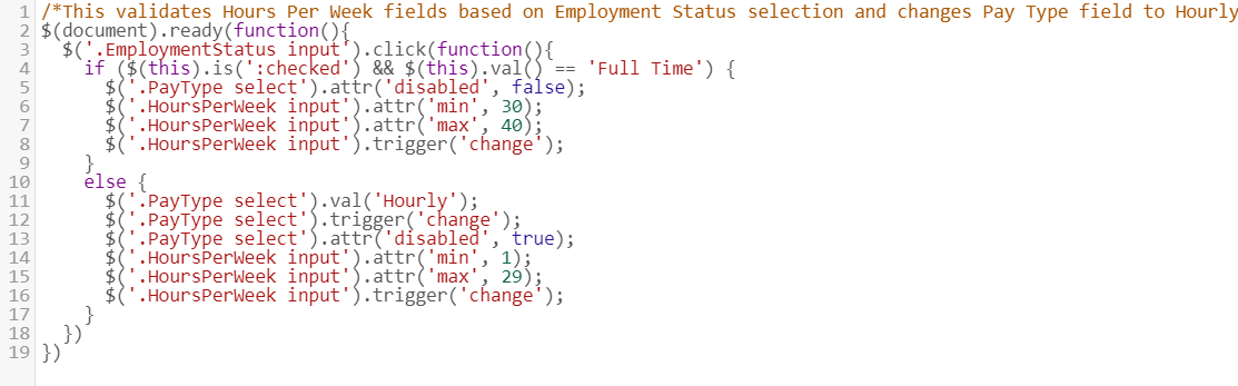Can this be accomplished with javascript? Or, is there is a better way to validate the Hours Per Week field? If not, a sample script would greatly be appreciated. Thanks!