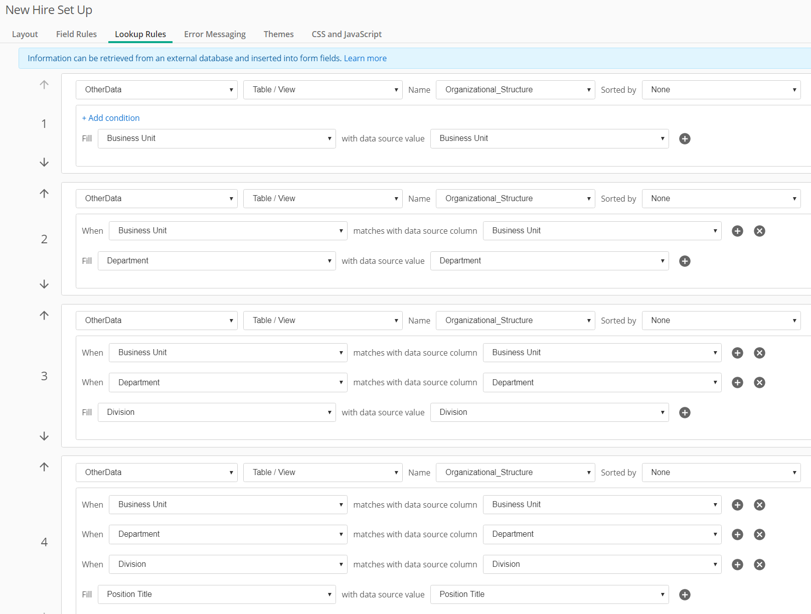 It appears the closes way to create a four-tier "dynamic field" like experience in forms is to use Lookup rules to populate drop down fields from a database table. As you can see from the images below, when the lookup rules have multiple "When" conditions, an Auto fill button will appear on the form next to the field specified in the second condition.