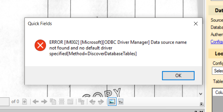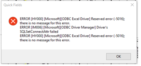 QuickFields is installed on the local machine Windows 7 pro sp1 (again they are using LF Cloud) and the excel file is on this local machine. I have tried to set up the ODBC using Data Source Type User Data Source Driver Excel Files but no matter what I pick I receive errors in QuickFields when I select a table.