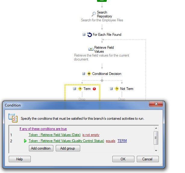 We are using LaserFische for Employee files and we have folders for Active and Inactive employees. I am trying to create a workflow that will look for either the word TERM in our Status Field or if the term date has data. This data is pulled from another database we have I have confirmed that the data is being pulled. When we try to implement he workflow it fails. I am using a Conditional Decision I have tried "Starting Entry: Field (Term Date) is empty. I have also tried several ways of looking for Term in the "Status" Field. I am not sure if I am being clear. Anyone have any suggestions?