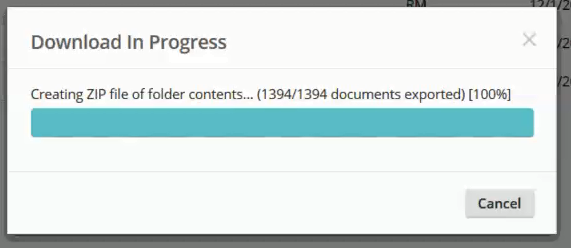 We have a client that is running into an issue where when downloading large folders from Web Access 10.2.1, it doesn't complete. It doesn't give any error messages that pop-up, it just stays on the "Download in Progress" screen, that it is Creating a zip file of the folder contents, and never completes the download. (See screenshot below.)