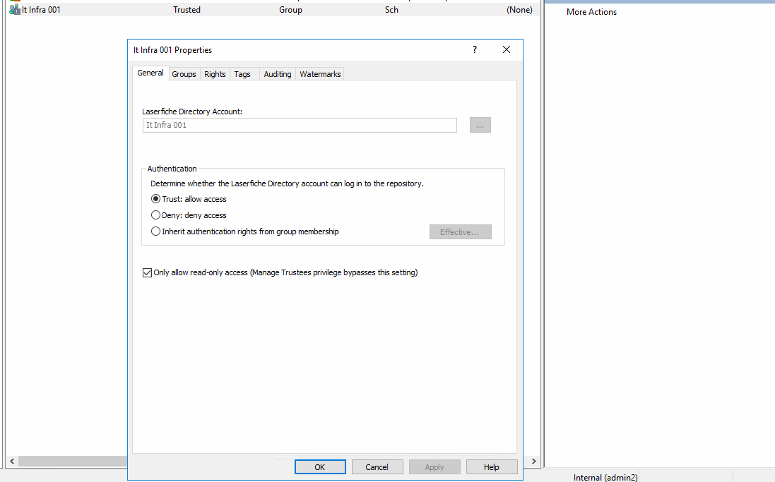 I have defined a LFDS group (IT Infra 001). I am currently using LF Directory Accounts in LF Administration Console and the LFDS group is set to 'Only allow read-only access'[Please see attached screenshot]. The concerned user is not present in LFDS as these users do not need a license when log in through WebLink Public Portal, thus they do not need to be set up in LFDS. But when the user tries to connect to WebLink Public Portal, a permission denied issue occurs. Thanks to advise whether the user should be created in LFDS with license sets to "None".