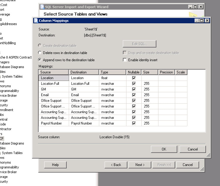 OK, so i got this working. I changed location the nvarchar. I was trying to change my other column to float.