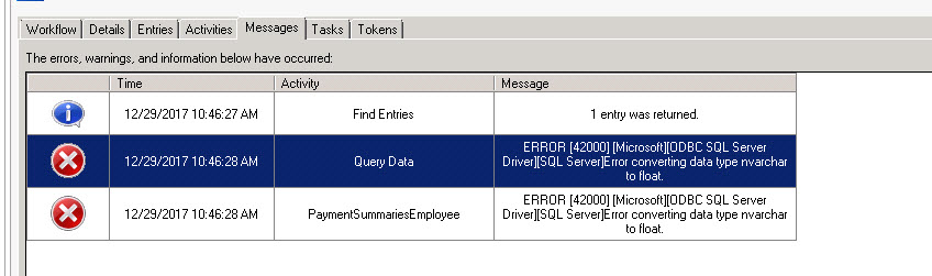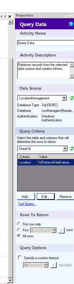 I have a couple of workflows that I was manually updating each type we opened a location. I have a different email being sent out based on the person assigned to the location. I have a SQL database with this information that i would like to query instead of updating each workflow. I get the error converting nvarchar to float. Anyone have ideas based on my screen shots?