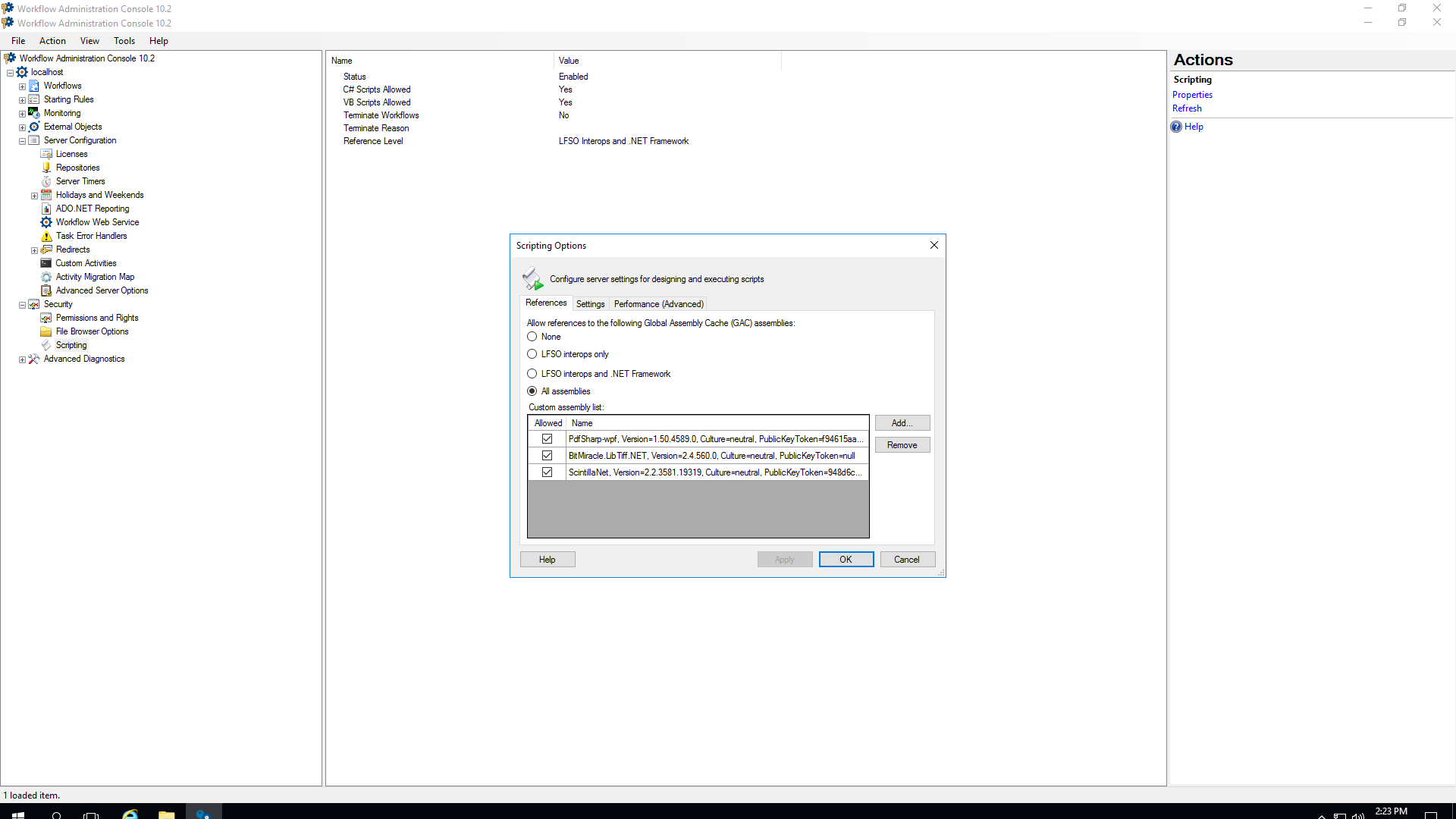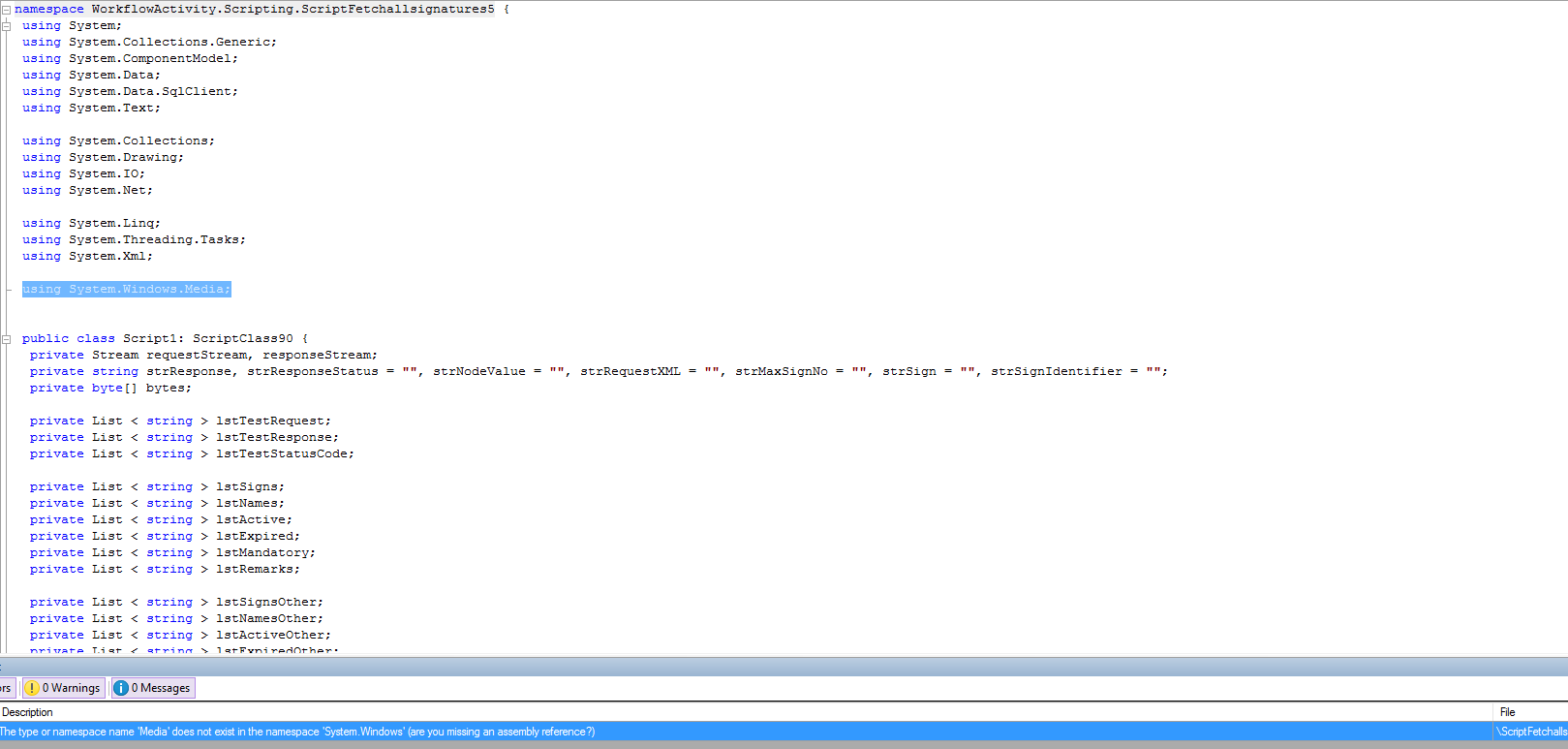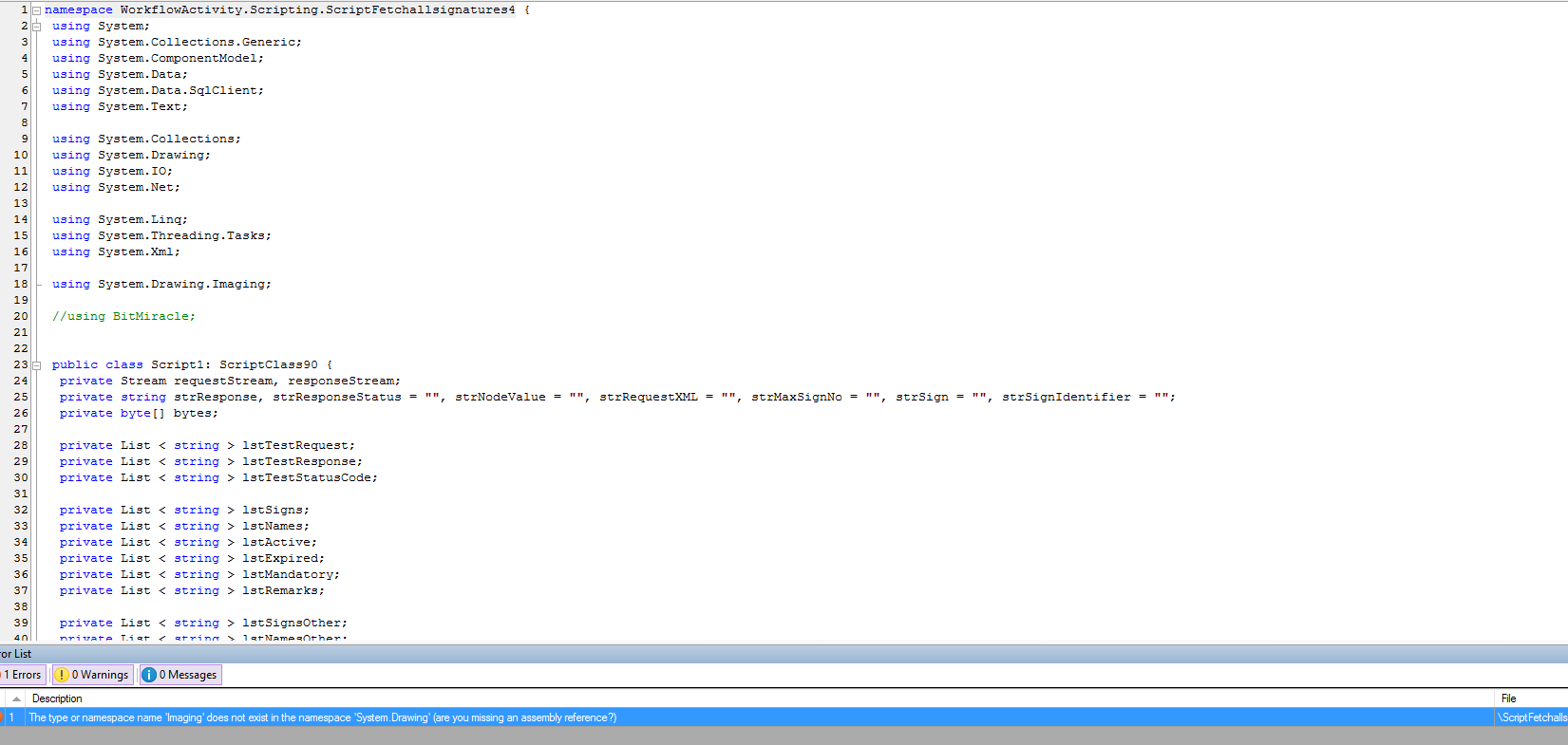 Hi, I wanted to split .tif format image files in Laserfiche Workflow. For that I needed System.Drawing.Imaging in the namespace declaration. But it is giving me error "The type or namespace named 'Imaging' could not be found (are you missing a using directive or an assembly reference?)". Also I have selected use all assemblies in the scripting properties in the Laserfiche Workflow Administration Console. Same issue with System.Windows.Media.