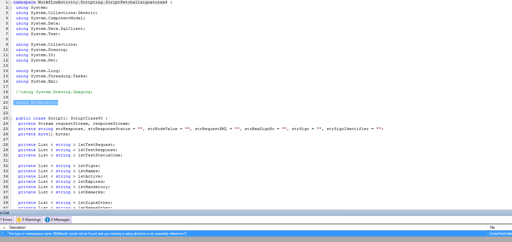 Hence I used BitMiracle LibTiff.NET library. I added the required DLL's to the custom activities as well as the scripting properties of the Laserfiche Workflow Administration Console. Still I'm not able to declare it in the namespace and use it in the script. The error is displayed as "The type or namespace named 'BitMiracle' could not be found (are you missing a using directive or an assembly reference?)".