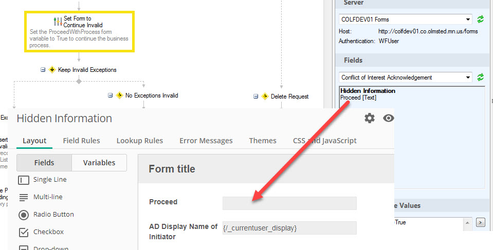 I have a process in forms where I have to verify if the person submitting the form is on a specific list.  At the point the form is submitted, I have it go to a workflow to pull the form information.  I use the information to check the list, then I pass a variable back to the form and the form splits based on the variable.  I also have a separate form (not the one the customer sees) that holds any "background" information I gather on the form or from workflow.