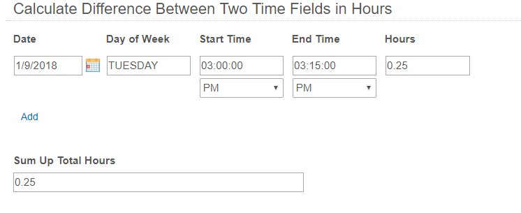 So far I have the layout of the form created. The employee chooses their name and job(scanning, indexing, etc.) from drop down menus, then enters the date, start time, and stop time. When the employee hits submit, I want to calculate the time based on the start and stop time and then have that information saved so it can be accessed for reports later.